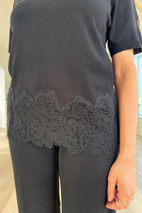 An easy and elegant everyday top with a soft feminine touch. This short-sleeve knit top features a clean, classic silhouette and a delicate lace trim at the hem that instantly elevates the look. Comfortable, lightweight and easy to style — it’s a perfect piece for both casual and dressier outfits 🤍