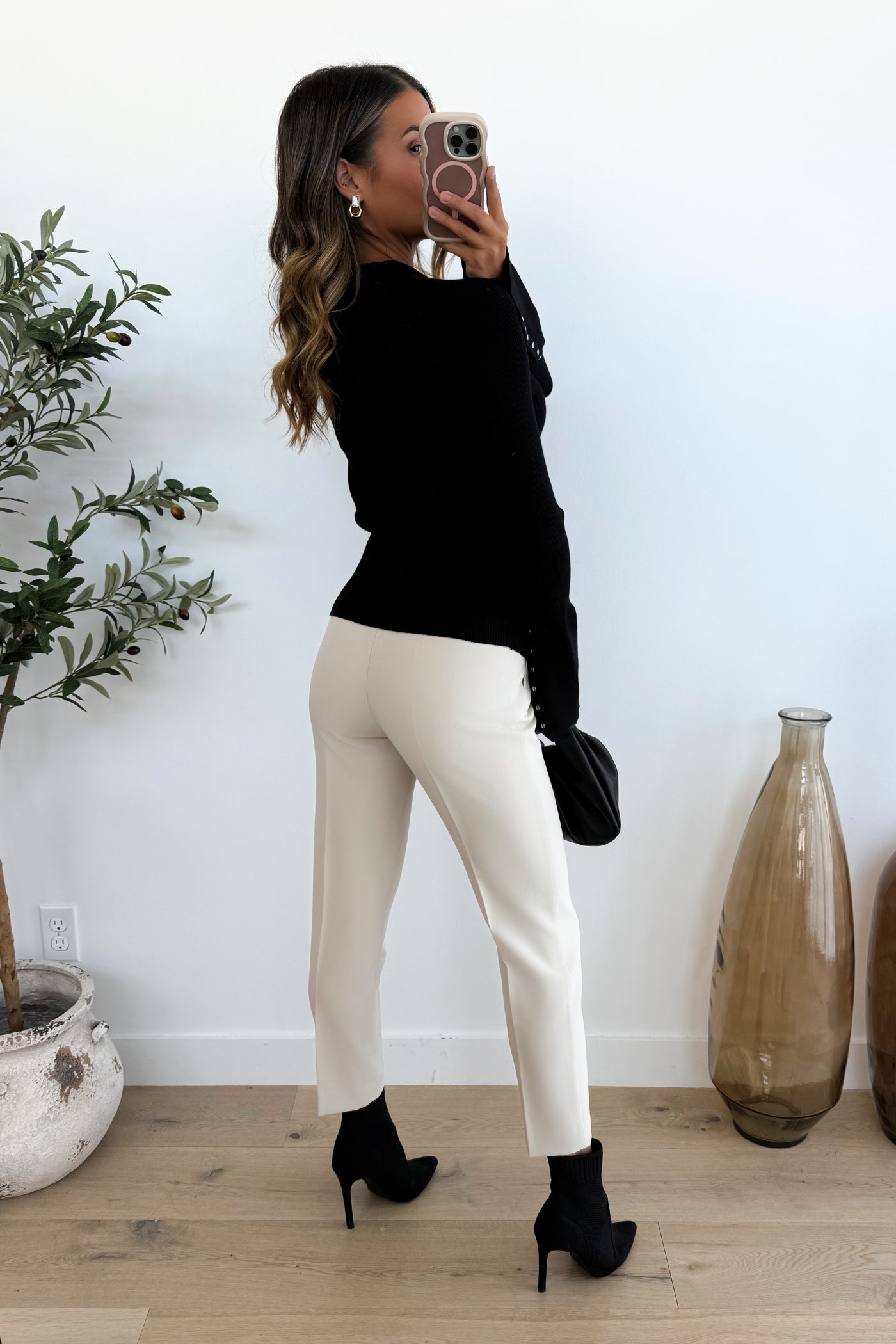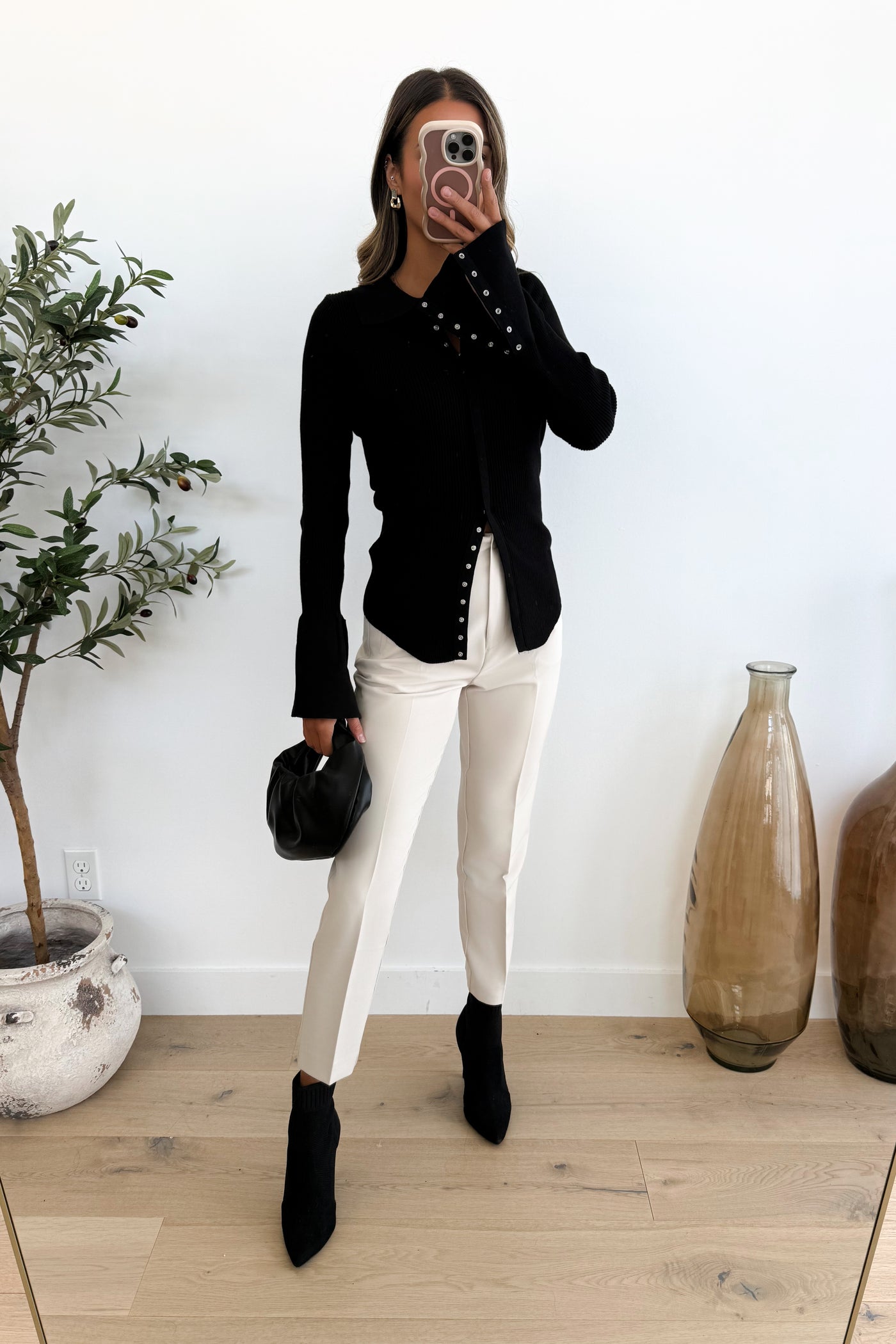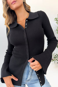 A chic and versatile essential, this long sleeve top is designed to be worn in multiple ways: buttoned up for a clean, classic look, or styled partially open for a trendy neckline and effortless vibe. The elongated cut and slightly flared sleeves at the wrists add a unique touch, while the soft ribbed fabric offers incredible stretch and comfort. Perfect for creating “clean girl” outfits with just the right amount of originality, this piece is a must-have you’ll reach for again and again.