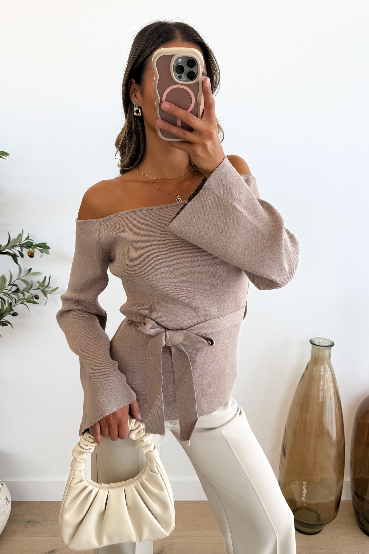 A chic and feminine piece designed to highlight your shoulders with effortless elegance. This off-shoulder sweater features flared long sleeves and comes with a matching belt to cinch at the waist for a flattering silhouette. Long enough to pair with leggings, yet refined enough to style with jeans and heels for a chic date-night look. Made from high-quality fabric that’s lightweight yet cozy, it’s the perfect choice for stylish autumn outfits.