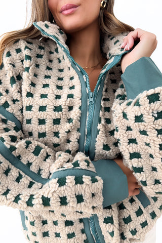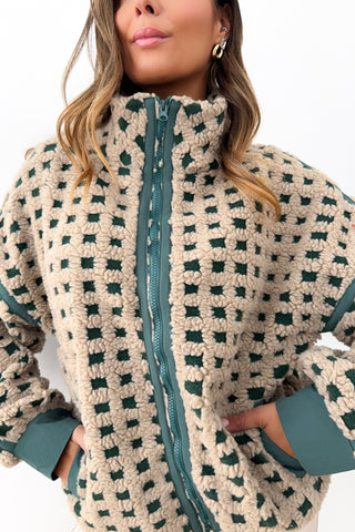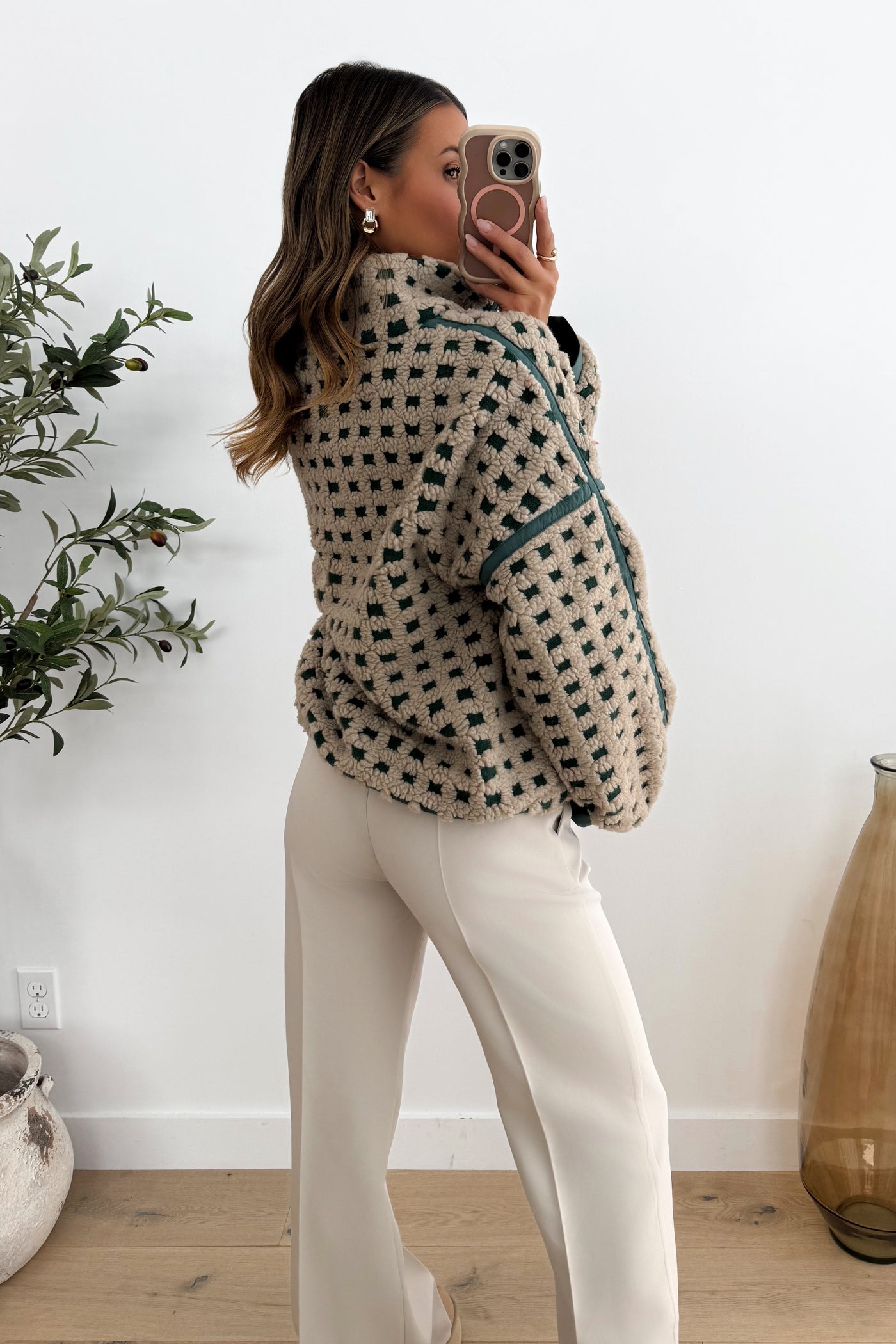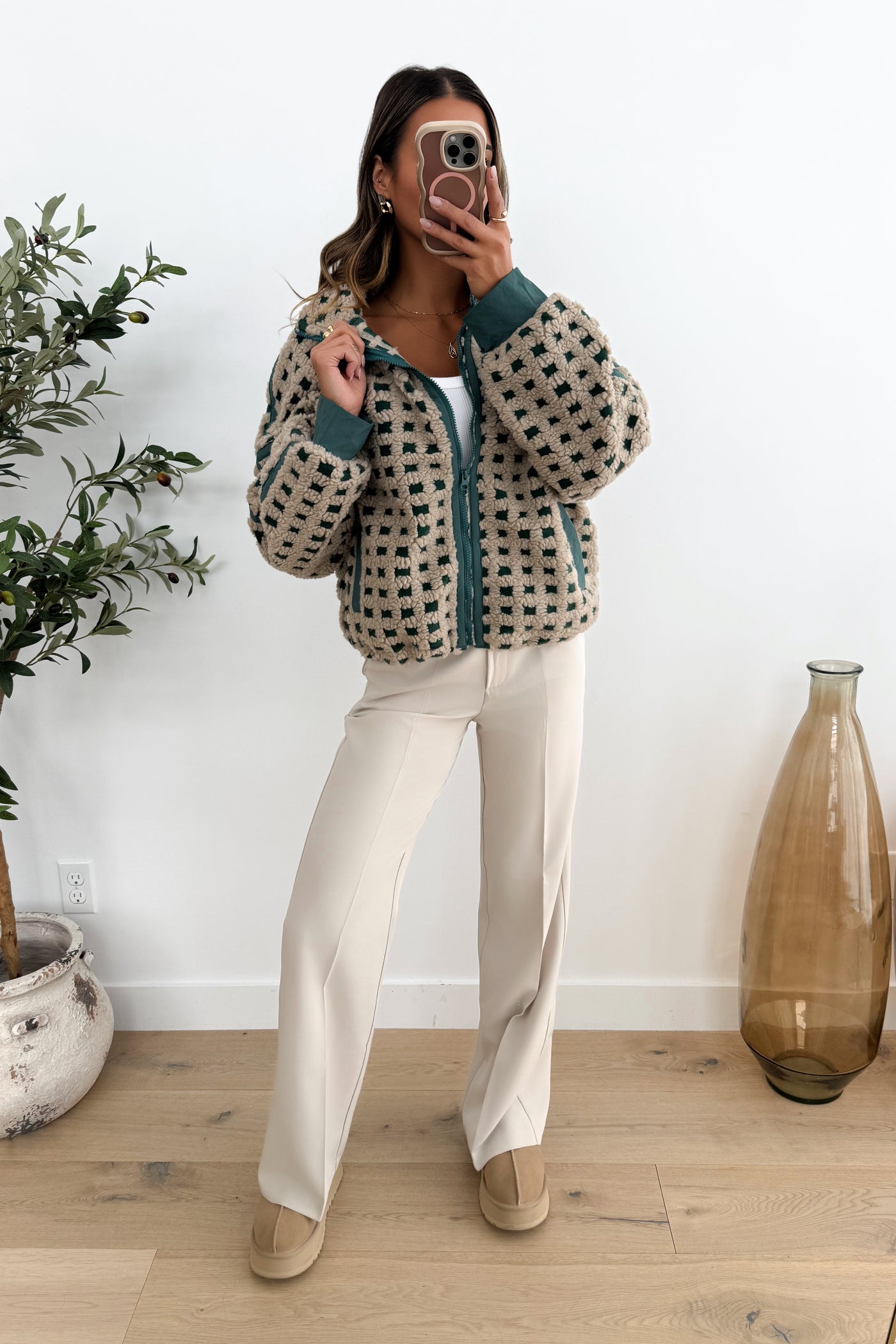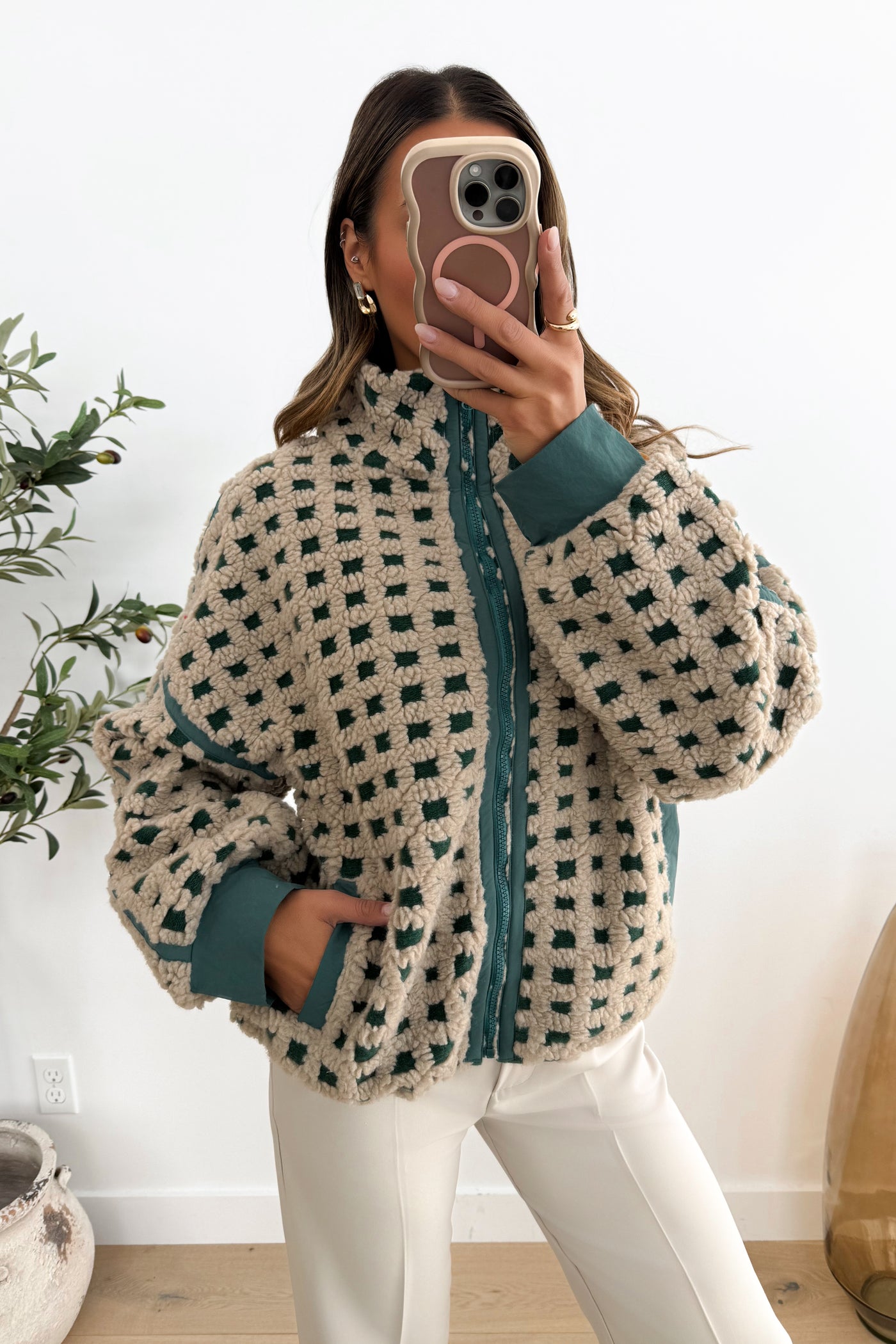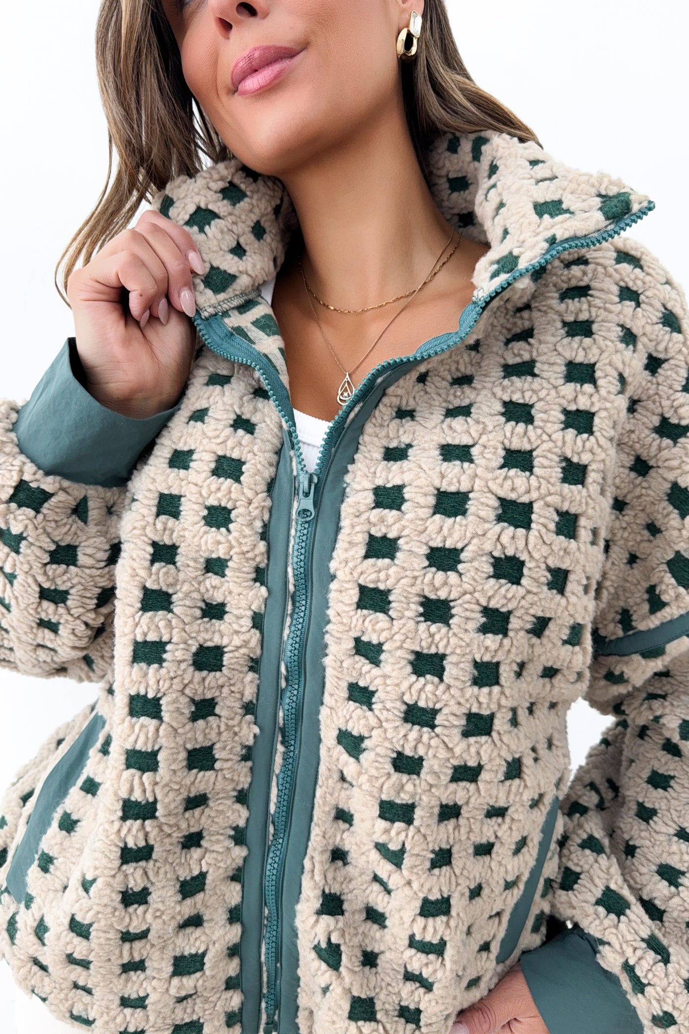 An effortlessly cool layering piece you’ll reach for all season long! This textured zip-up jacket features a soft teddy-style fabric with a beautiful contrast geometric pattern that adds depth and character to your look. Designed with a relaxed fit, a structured collar, and zip-front closure, it’s the perfect balance of cozy comfort and elevated style 💚🤍.