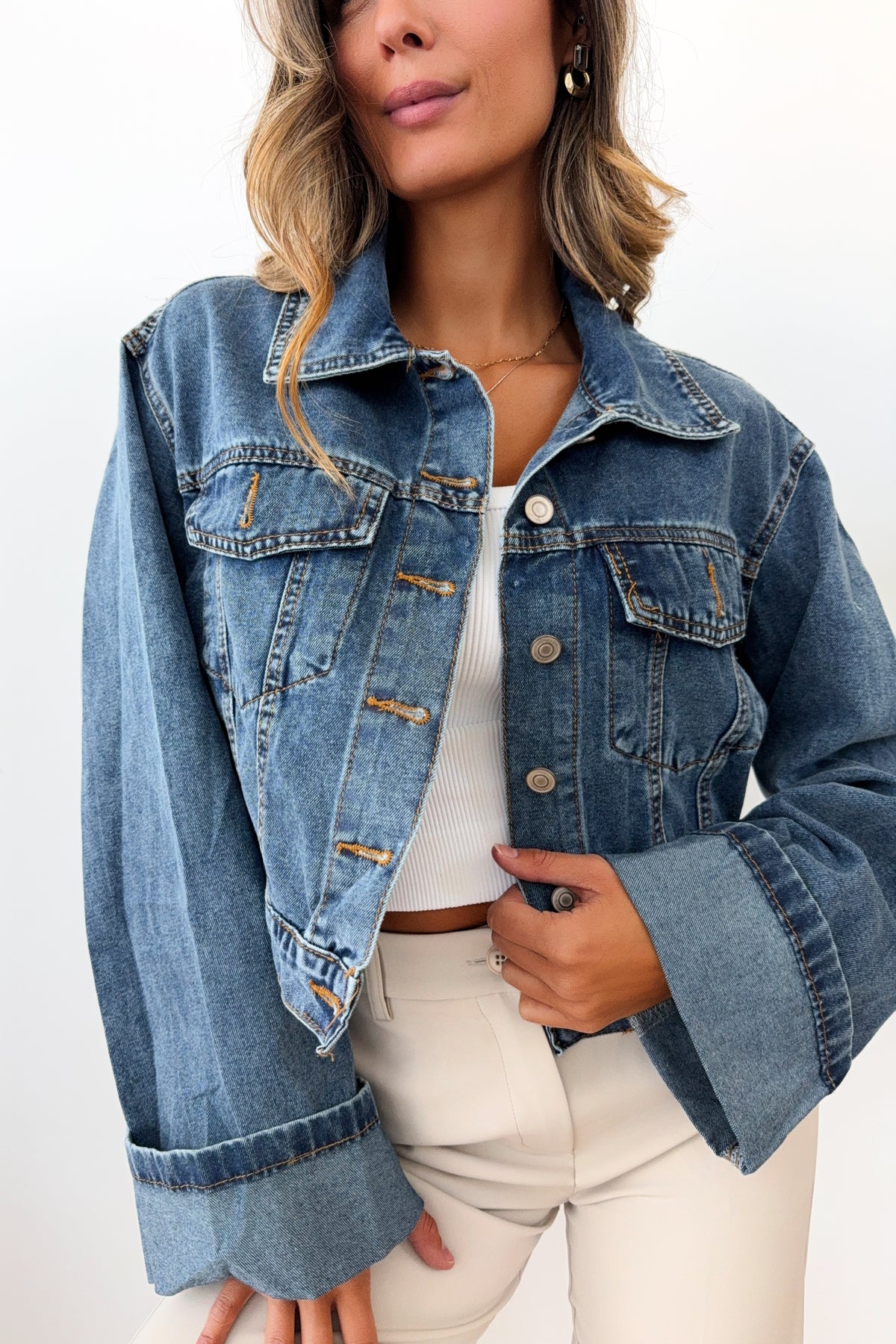 This isn’t your average denim jacket. Featuring a slightly cropped fit and a classic collar, it stands out with its extra-long sleeves flared at the cuffs and finished with a stylish turned-up edge. Perfect for creating effortless “clean girl” outfits with just the right touch of originality, this versatile piece will quickly become a wardrobe favorite. Wear it with a basic top and leggings for a casual chic vibe, or go bold with a denim-on-denim look. Lightweight yet durable, it’s the ideal transitional jacket for mid-season styling.