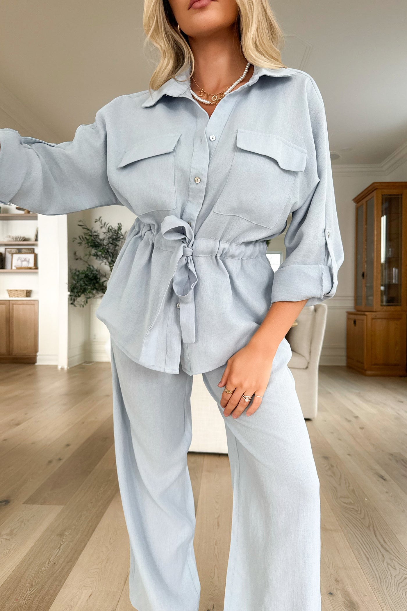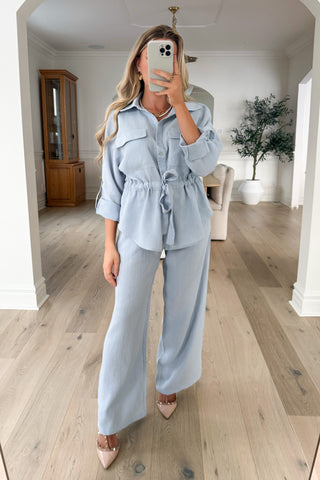 Your new go-to matching set for a clean, elevated and super flattering look. This two-piece set features a button-front shirt with chest pockets and rolled sleeves, paired with matching wide-leg pants and a tie-waist for a perfectly defined silhouette. Easy to wear, but never too casual — it’s the perfect balance between chic and comfortable 🤍
