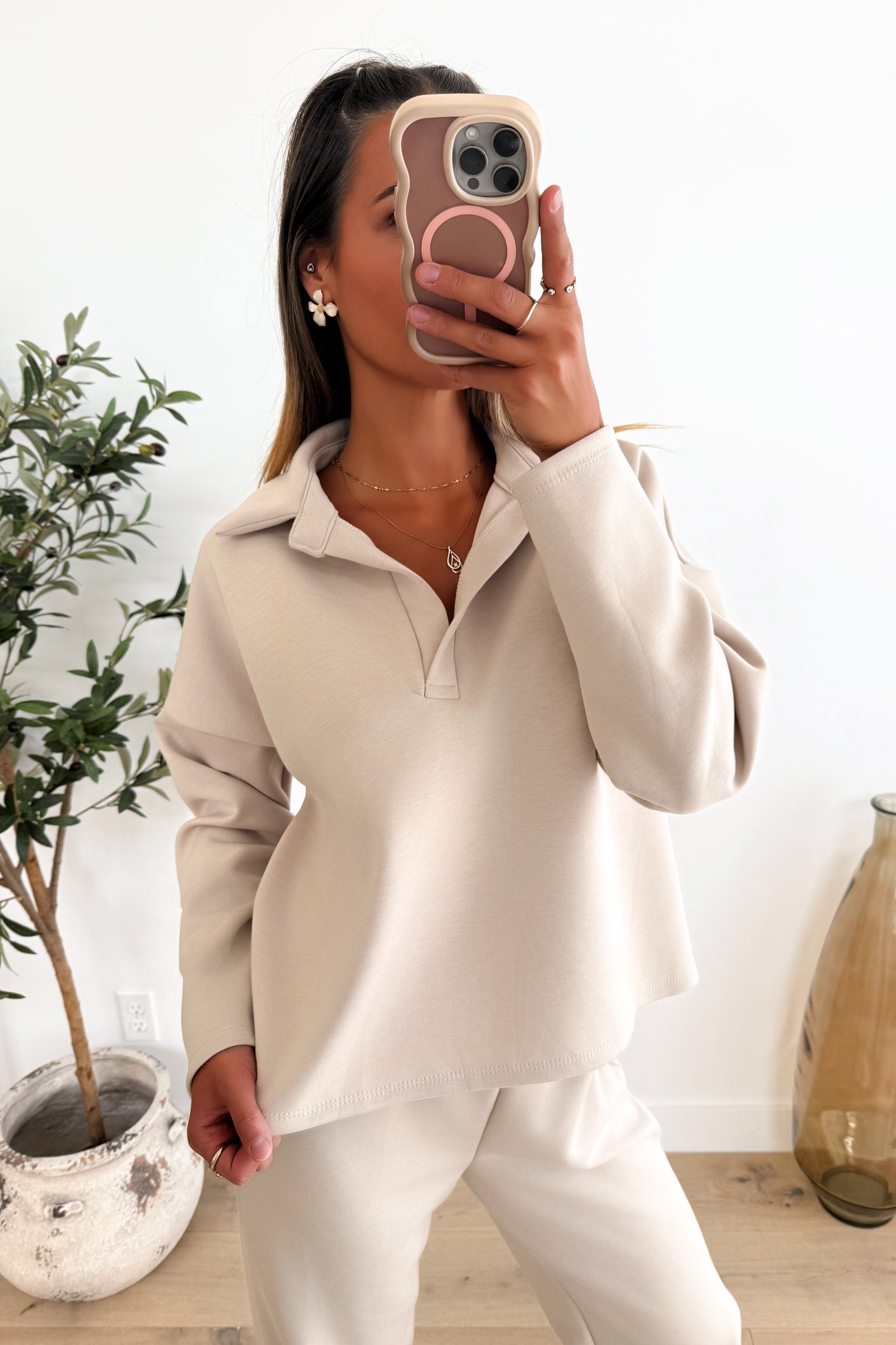 A stylish yet comfortable set designed for everyday wear with a refined touch. Featuring relaxed elastic-waist pants with pockets and a slightly oversized top with a V-neckline and classic collar, this outfit strikes the perfect balance between comfort and sophistication. Whether you’re running errands, lounging at home, or meeting friends for a casual outing, this set keeps you looking polished with minimal effort.