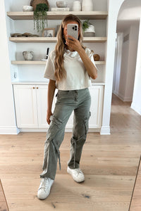 Sortie : Habillez ce jeans cargo avec un crop top et des sandales à talons hauts pour une tenue élégante et sexy, parfaite pour une soirée entre amis.